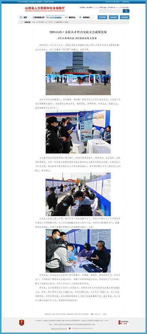 据山西省人力资源和社会保障厅网站消息,10月31日,山西省人社厅主办、省就业局承办的2021山西•太原人才智力交流大会圆满落幕。大会打造线上、线下并重的“双引擎”新模式,成果丰硕。