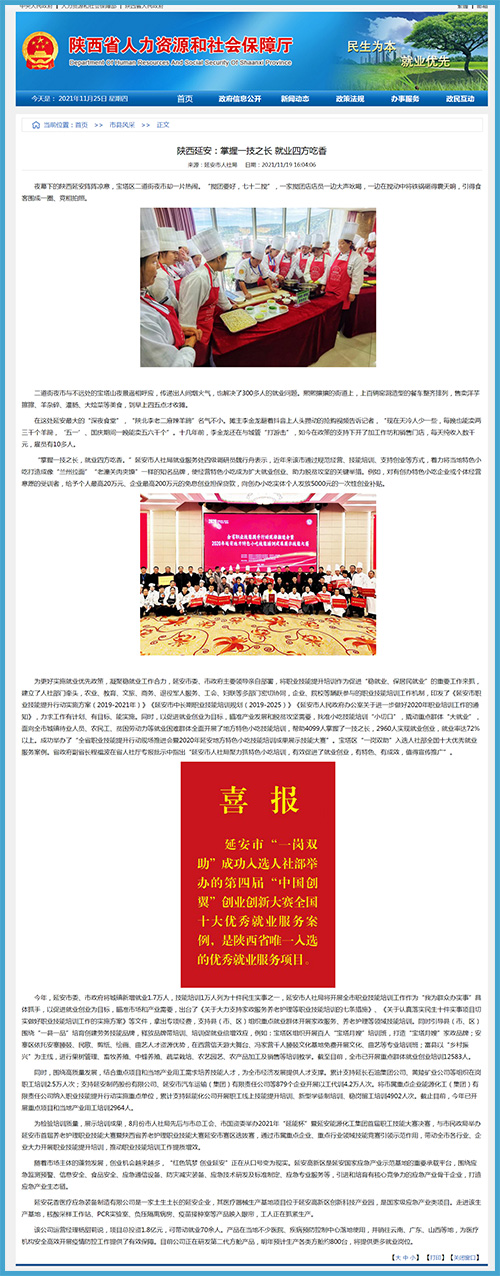 为更好实施就业优先政策,凝聚稳就业工作合力,延安市委、市政府主要领导亲自部署,将职业技能提升培训作为促进“稳就业、保居民就业”的重要工作来抓,建立了人社部门牵头,农业、教育、文旅、商务、退役军人服务、工会、妇联等多部门密切协同,企业、院校等踊跃参与的职业技能培训工作机制,印发了《延安市职业技能提升行动实施方案(2019-2021年)》《延安市中长期职业技能培训规划(2019-2025)》《延安市人民政府办公室关于进一步做好2020年职业培训工作的通知》,力求工作有计划、有目标、能实施。同时,以促进就业创业为目标,瞄准产业发展和脱贫攻坚需要,找准小吃技能培训“小切口”,撬动重点群体“大就业”,面向全市城镇待业人员、农民工、贫困劳动力等就业困难群体全面开展了地方特色小吃技能培训,帮助4099人掌握了一技之长,2960人实现就业创业,就业率达72%以上。成功举办了“全省职业技能提升行动现场推进会暨2020年延安地方特色小吃技能培训成果展示技能大赛”。宝塔区“一岗双助”入选人社部全国十大优秀就业服务案例。省政府副省长程福波在省人社厅专报批示中指出“延安市人社局聚力抓特色小吃培训,有效促进了就业创业,有特色、有成效,值得宣传推广”。
