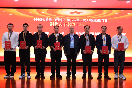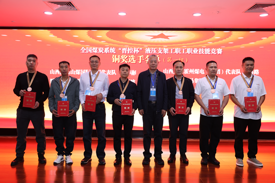 中国技协煤炭专业委员会副会长曹峰为荣获全国煤炭系统“晋控杯”液压支架工职工职业技能竞赛部分选手代表颁奖。