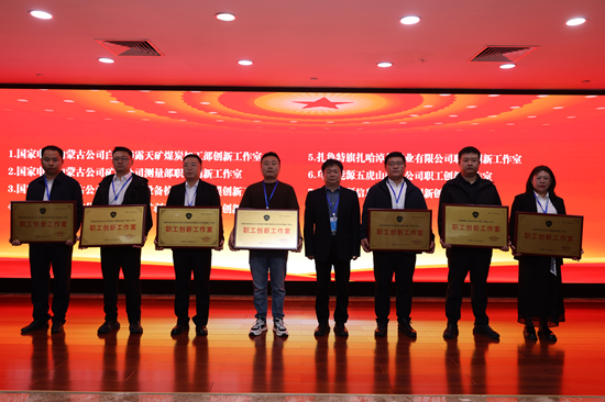 中国技协煤炭专业委员会副秘书长梁志山为全国煤炭系统首批被命名的“中国技协创新工作室”的部分创新工作室代表颁发牌匾。