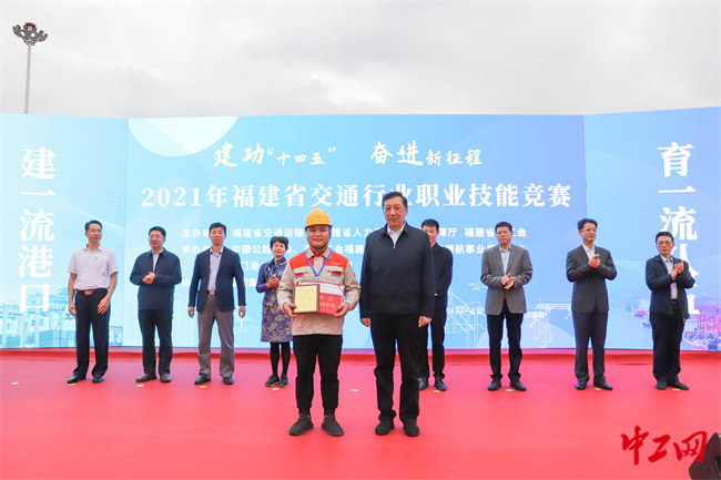 中工网讯 11月18日下午,由福建省交通运输厅、福建省人力资源和社会保障厅、福建省总工会主办的福建省交通行业职业技能竞赛起重装卸机械操作工(集装箱龙门吊)项目比赛在厦门海天码头圆满落幕。