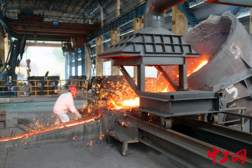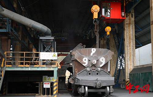 吊钩缓缓提升,铁水罐倾斜,罐中的铁水慢慢流出,倾倒至指定的铁水溜槽模具中,铸锭工艺才算完成。