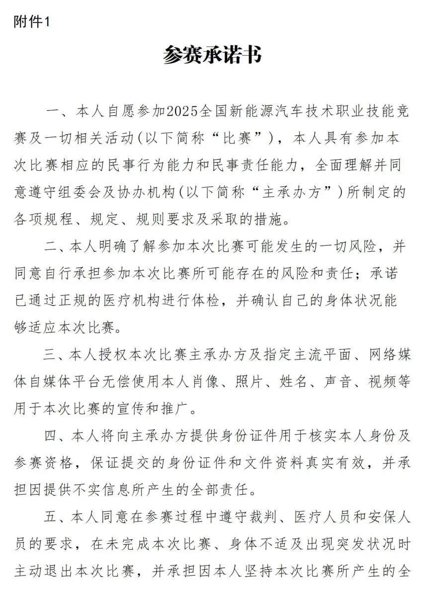 3. 各代表队和选手需填写《参赛承诺书》、《2025全国新能源汽车技术职业技能竞赛报名表》,并将签字盖章纸质版、电子版报大赛组委会进行资格确认,报名截止日期9月19日17:00。