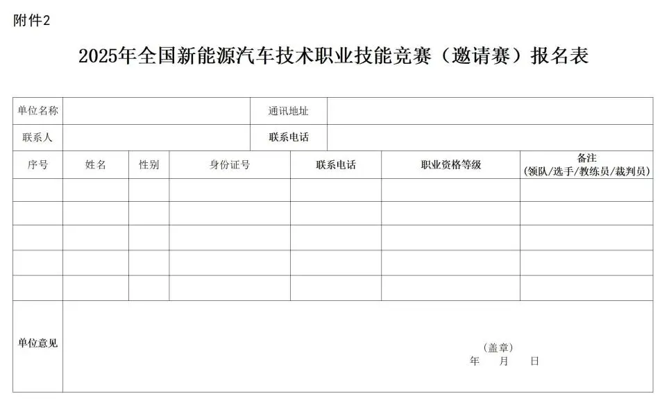2.2025全国新能源汽车技术职业技能竞赛报名表
