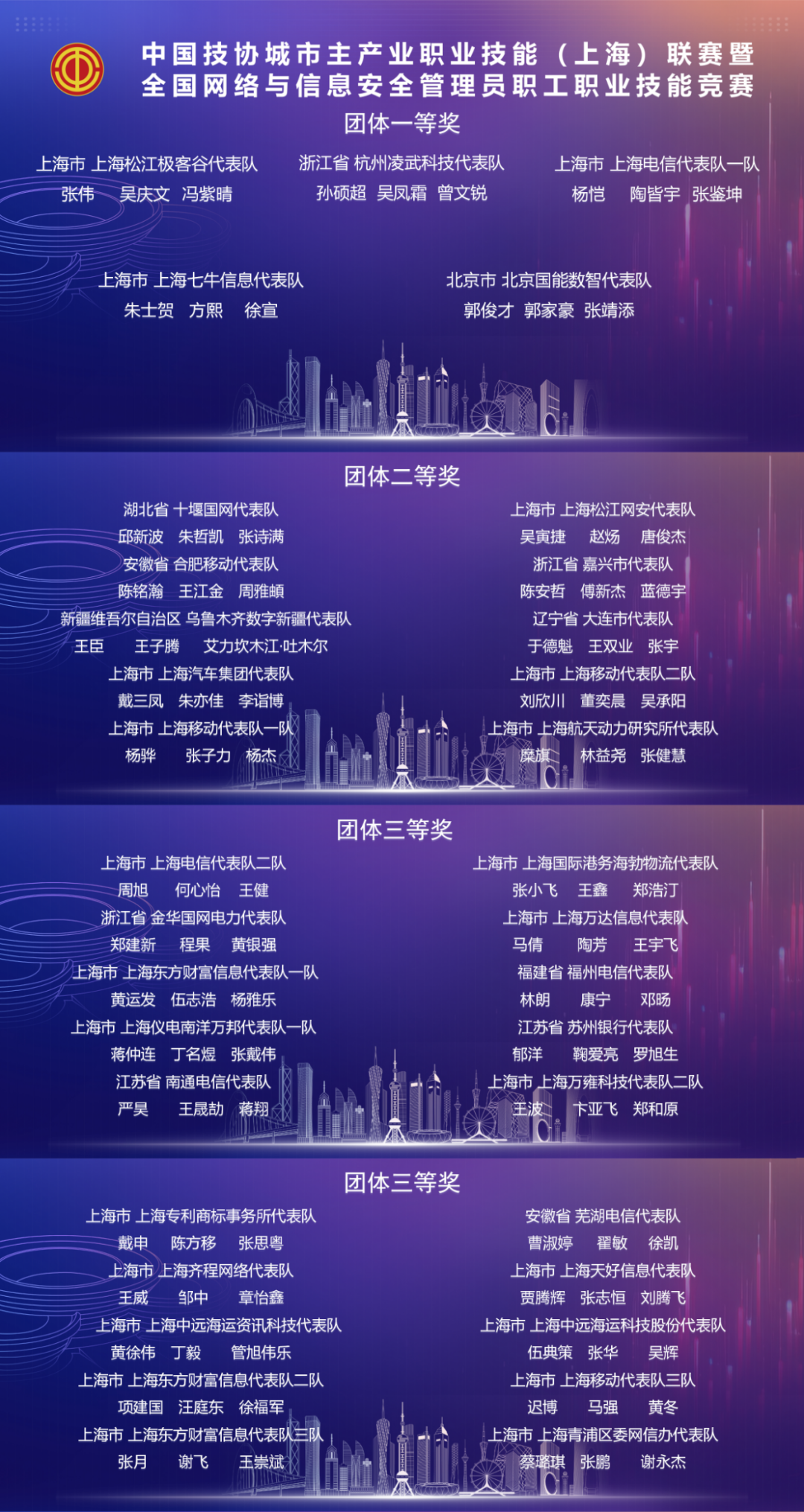 经过1天的紧张竞赛,吴庆文等10名选手获个人一等奖,杨雅乐等20名选手获个人二等奖,王子腾等30名选手获个人三等奖;上海松江极客谷代表队等5个团队获团体一等奖;湖北省十堰国网代表队等10个团队获团体二等奖;上海电信代表队二队等20个团队获团体三等奖。中国职工技术协会为10名个人一等奖获奖选手同步授予“金牌技工”荣誉称号,20名二等奖获奖选手同步授予“银牌技工”荣誉称号。