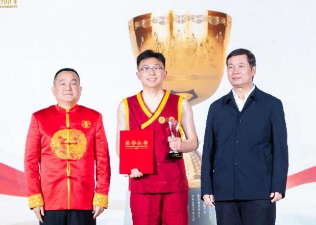 全国总工会原副主席、书记处书记,中国职工技术协会理事长李世明(右一),泸州老窖集团(股份)公司党委书记、董事长刘淼(左一)为总决赛冠军何先强颁奖