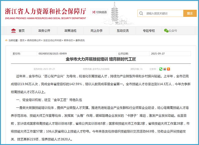 据浙江省人力资源和社会保障厅官网消息,近年来,浙江金华市以“匠心聚产业兴”为导向,精准化引育技能人才,持续为产业转型升级和乡村振兴赋能。上半年,全市已完成培训13.96万人次,完成全年省定目标的142.59%,培训人数完成率居全省第一。全市技能人才总量达到114.3万人,今年力争新增高技能人才2万人以上。