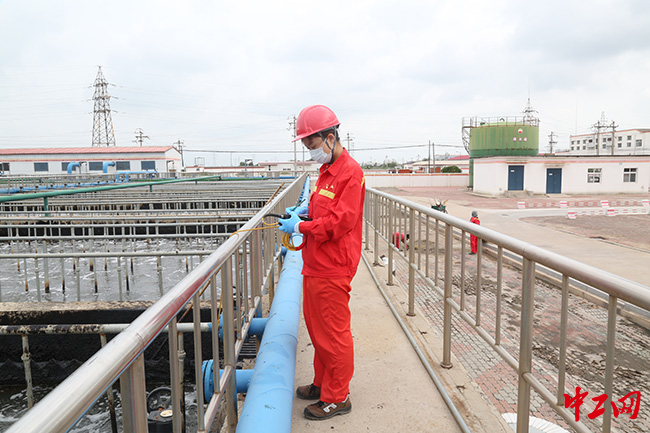 8月23日上午,冀东油田油气集输公司高尚堡联合站化验女工张晶莹和孙倩顺着扶梯登上好氧池检测水中溶解氧,她们需要找到24个不同的测试点,将测试仪器下到池子里,再将仪器显示数据分段记录下来,这只是她们工作的“冰山一角”。
